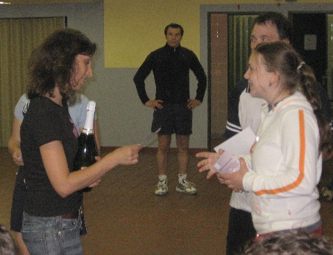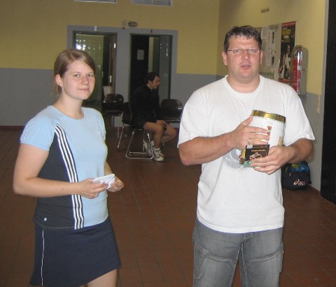 | Am Samstag, den 05. Mai 2007 fand im Freizeittreff Pfahl in Konz einen Herrendoppel- Turnier statt. Da sich kein Herrendoppel des SV Morbach fand um dort zu spielen, traten Rosi Marx und Gerd Göhl kurzerhand als Herrendoppel in Konz an. In der Gruppenphase hatten beide keine Probleme mit den Herrendoppel und konnten sich als Gruppen erster für das Viertelfinale qualifizieren. Dort traf man auf einen starken Gegner und hatte große Mühe. Schließlich gelang es im dritten Satz die „Big Points“ zu machen und sich den Einzug ins Halbfinale zu sichern. Im Halbfinale war es dann vorbei. Gegen den späteren Turniersieg, die Brüder Spang, hatte man keine Chance und unterlag deutlich. Nun hoffte man auf das „kleine Finale“. Doch leider konnte der Gegner nicht mehr antreten, sodass man kampflos Platz 3 belegte. |