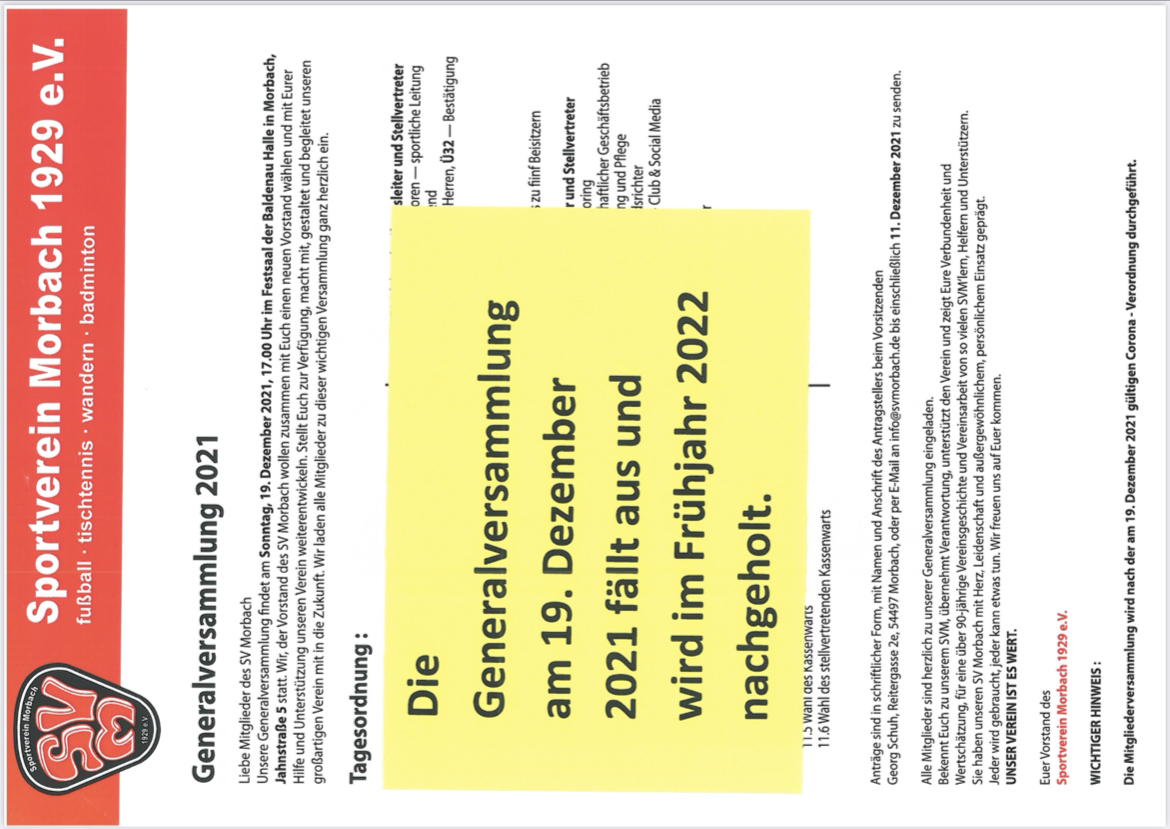 Die vorgesehene Generalversammlung des SV Morbach 1929 e.V. am Sonntag, 19. Dezember 2021 ist abgesagt.