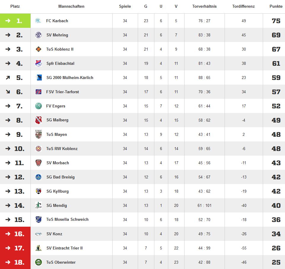 Hintere Reihe v.L.: Mittlere Reihe v.L.: Vordere Reihe v.L: Tabelle Quelle: Fussball.de Previous Pause Weiter Rheinlandliga 1. Spieltag Sonntag, 10. August 2014 - 14:30 Am Stadion, 54329 Konz, RASEN SV Konz 0:1 SV Morbach (88') 0:1 Fabrice Schirra Video Rheinlandliga 2. Spieltag Sonntag, 17. August 2014 - 14:30 Alfons-Jakobs-Stadion Morbach, RASENPLATZ SV Morbach 1:0 FV Engers (88') 1:0 Fabrice Schirra Video Rheinlandliga 3. Spieltag Samstag, 23. August 2014 - 14:30 Schulstraße 57629 Malberg, KUNSTRASEN SG Malberg 2:1 SV Morbach (67') 1:0 Kenny Scherreicks | (77') 1:1 Andre Petry | (89') 2:1 Marcel Quast Rheinlandliga 4. Spieltag Sonntag, 7. September 2014 - 14:30 Alfons-Jakobs-Stadion Morbach, RASENPLATZ SV Morbach 2:4 SV Eintracht Trier II Video Rheinlandliga 5. Spieltag Mittwoch, 10. September 2014 - 20:00 Alfons-Jakobs-Stadion Morbach, KUNSTRASENPLATZ SV Morbach 0:1 Spfr. Eisbachtal Video Rheinlandliga 6. Spieltag Sonntag, 14. September 2014 - 14:30 Brauerstraße, 56743 Mendig, KUNSTRASEN SG Mendig 4:2 SV Morbach Rheinlandliga 7. Spieltag Sonntag, 21. September 2014 - 14:30 Alfons-Jakobs-Stadion Morbach, RASENPLATZ SV Morbach 0:3 FSV Trier-Tarforst Video Rheinlandpokal 2. Runde Mittwoch, 24. September 2014 - 20:00 Sportzentrum, 54516 Wittlich, KUNSTRASEN SG Lüxem/Wittlich 1:2 SV Morbach Rheinlandliga 8. Spieltag Sonntag, 28. September 2014 - 14:30 Sportplatz an der L213, 56281 Karbach, RASENPLATZ FC Karbach 3:2 SV Morbach Rheinlandliga 9. Spieltag Sonntag, 5. Oktober 2014 - 14:30 Alfons-Jakobs-Stadion Morbach, RASENPLATZ SV Morbach 2:0 SG Bad Breisig Rheinlandpokal 3. Runde Mittwoch, 15. Oktober 2014 - 19:30 Sportplatz Mörschbach 0:4 SV Morbach Rheinlandliga 10. Spieltag Samstag, 18. Oktober 2014 - 17:00 Bitburger Straße, 54657 Badem, RASENPLATZ SG Badem 0:1 SV Morbach Rheinlandliga 11. Spieltag Mittwoch, 22. Oktober 2014 - 20:00 Jupp-Gauchel-Str. - Oberwerth, 56075 Koblenz, KUNSTRASEN TuS Rot-Weiss Koblenz 3:2 SV Morbach Rheinlandliga 12. Spieltag Sonntag, 26. Oktober 2014 - 14:30 Alfons-Jakobs-Stadion Morbach, RASENPLATZ SV Morbach 0:3 TuS Koblenz II Video Rheinlandliga 13. Spieltag Samstag, 1. November 2014 - 15:00 SPORTANLAGE, 54346 MEHRING, KUNSTRASEN SV Mehring 2:1 SV Morbach Video Rheinlandliga 14. Spieltag Sonntag, 9. November 2014 - 14:30 Alfons-Jakobs-Stadion Morbach, RASENPLATZ SV Morbach 1:1 TuS Schweich Video Rheinlandliga 15. Spieltag Freitag, 14. November 2014 - 20:00 Judengäßchen, 56218 Mülheim-Kärlich, KUNSTRASEN SG Mülheim-Kärlich 4:1 SV Morbach Rheinlandliga 16. Spieltag Mittwoch, 19. November 2014 - 19:45 Mayen - Nettetalstadion SV Morbach 0:1 TuS Mayen Rheinlandliga 17. Spieltag Sonntag, 23. November 2014 - 14:30 Alfons-Jakobs-Stadion Morbach, RASENPLATZ SV Morbach 2:1 TuS Oberwinter Video Rheinlandpokal Achtelfinale Mittwoch, 26. November 2014 - 20:00 Sportplatz Buchholz 0:1 SV Morbach Rheinlandliga 18. Spieltag Sonntag, 30. November 2014 - 14:30 Alfons-Jakobs-Stadion Morbach, RASENPLATZ SV Morbach 2:4 SV Konz Video Rheinlandliga 19. Spieltag Sonntag, 7. Dezember 2014 - 14:00 Sportplatz-Turnhalle, 56566 Engers, Rasenplatz FV Engers 2:0 SV Morbach Rheinlandliga 20. Spieltag Sonntag, 22. Februar 2015 - 14:30 Alfons-Jakobs-Stadion Morbach, RASENPLATZ SV Morbach 1:0 SG Malberg Video Rheinlandliga 21. Spieltag Sonntag, 8. März 2015 - 14:30 Alfons-Jakobs-Stadion Morbach, KUNSTRASENPLATZ SV Morbach 1:0 TuS Rot-Weiss Koblenz Video Rheinlandliga 22. Spieltag Mittwoch, 11. März 2015 - 20:00 Eppenroder Straße, 56412 Nentershausen, RASENPLATZ Spfr. Eisbachtal 2:1 SV Morbach Rheinlandliga 23. Spieltag Sonntag, 15. März 2015 - 16:00 Am Trimmelter Hof, 54296 Trier-Tarforst, RASENPLATZ SV Eintracht Trier II 0:2 SV Morbach Rheinlandpokal Viertelfinale Mittwoch, 18. März 2015 - 19:30 Sportplatz Leiwen 0:3 SV Morbach Video Rheinlandliga 24. Spieltag Sonntag, 22. März 2015 - 14:30 Alfons-Jakobs-Stadion Morbach, RASENPLATZ SV Morbach 1:0 SG Mendig Video Rheinlandliga 25. Spieltag Samstag, 28. März 2015 - 17:30 Am Trimmelter Hof, 54296 Trier-Tarforst, RASENPLATZ FSV Trier-Tarforst 3:0 SV Morbach Rheinlandliga 26. Spieltag Mittwoch, 1. April 2015 - 19:30 Alfons-Jakobs-Stadion Morbach, KUNSTRASENPLATZ SV Morbach 2:0 FC Karbach Video Rheinlandliga 27. Spieltag Sonntag, 5. April 2015 - 14:30 Am Weißen Kreuz, 53498 Bad Breisig, KUNSTRASEN SG Bad Breisig 3:5 SV Morbach Rheinlandliga 28. Spieltag Samstag, 11. April 2015 - 16:00 Alfons-Jakobs-Stadion Morbach, RASENPLATZ SV Morbach 2:0 TuS Mayen Video Rheinlandliga 29. Spieltag Sonntag, 19. April 2015 - 14:30 Alfons-Jakobs-Stadion Morbach, RASENPLATZ SV Morbach 1:2 SG Badem Video Rheinlandpokal Halbfinale Mittwoch, 22. April 2015 - 19:30 Alfons-Jakobs-Stadion Morbach, KUNSTRASENPLATZ SV Morbach 1:2 Video Rheinlandliga 30. Spieltag Sonntag, 26. April 2015 - 14:30 Jupp-Gauchel-Str. - Oberwerth, 56075 Koblenz, KUNSTRASEN TuS Koblenz II 0:0 SV Morbach Rheinlandliga 31. Spieltag Sonntag, 3. Mai 2015 - 15:30 Alfons-Jakobs-Stadion Morbach, RASENPLATZ SV Morbach 0:1 SV Mehring Video Rheinlandliga 32. Spieltag Sonntag, 10. Mai 2015 - 15:00 Mathenstr., 54338 Schweich, KUNSTRASEN TuS Schweich 1:1 SV Morbach Rheinlandliga 33. Spieltag Sonntag, 17. Mai 2015 - 14:30 Alfons-Jakobs-Stadion Morbach, RASENPLATZ SV Morbach 3:4 SG Mülheim-Kärlich Video Rheinlandliga 34. Spieltag Samstag, 23. Mai 2015 - 17:00 Am Erlenbrunnen, 53424 Oberwinter-Bandorf, KUNSTRASEN TuS Oberwinter 3:3 SV Morbach