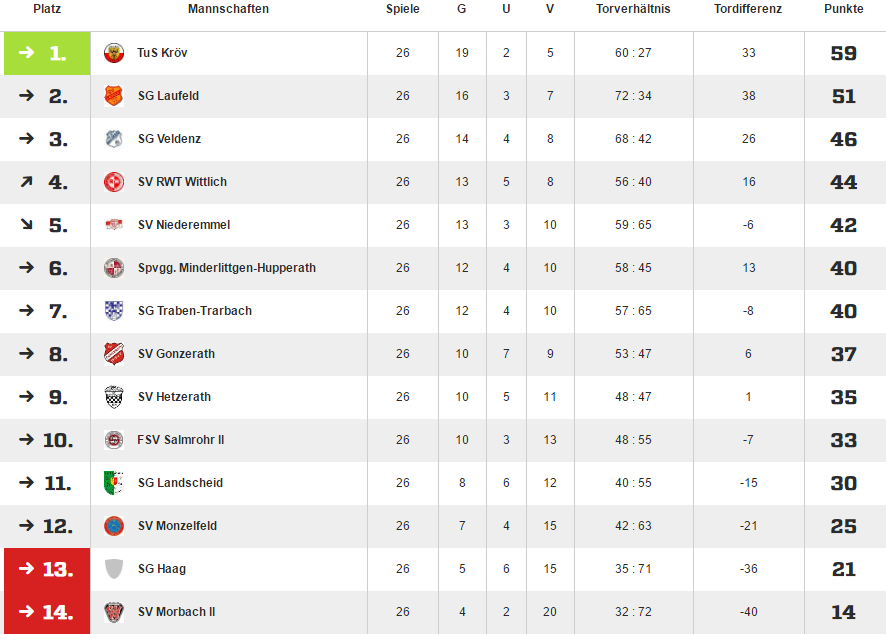 Tabelle Quelle: Fussball.de Previous Pause Weiter Kreispokal 1. Runde Samstag, 8. August 2015 - 17:00 Sportplatz Siebenborn, 54484 Maring-Noviand, RASENPLATZ SG Moseltal Lieser 2:1 SV Morbach II Kreisliga A - Mosel 1. Spieltag Sonntag, 16. August 2015 - 14:30 Kröver Berg, 54536 Kröv, RASENPLATZ TuS Kröv 2-0 SV Morbach II Spielbericht Kreisliga A - Mosel 2. Spieltag Sonntag, 23. August 2015 - 14:30 Alfons-Jakobs-Stadion Morbach, RASENPLATZ SV Morbach II 3-1 Spvgg Minderlittgen 0:1 Christoph Merges (35.) | 1:1 Jonas Mart (62.) | 2:1 Nico Schmitt ( 67.) | 3:1 Nico Schmitt (82.) Spielbericht Video Kreisliga A - Mosel 3. Spieltag Sonntag, 30. August 2015 - 14:30 Alfons-Jakobs-Stadion Morbach, RASENPLATZ SV Morbach II 4-3 SV RW Wittlich 1:0 Flo Galle (25.) | 2:0 Flo Galle (27.) | 3:0 Florian Szölösi (42.) | 3:1 El-Arja (43.) | 4:1 Jonas Mart, Foulelfmeter (50.) | 4:2 FE Souza (74.) | 4:3 Köhler (90.) Spielbericht Video Kreisliga A - Mosel 4. Spieltag Freitag, 4. September 2015 - 20:00 Im Kordel, 54528 Salmtal-Salmrohr, KUNSTRASEN FSV Salmrohr II 5:1 SV Morbach II 1:0 Marcel Ewertz (37.) | 1:1 Niko Schmitt (41.) | 2:1 Sebastian Ting (42.) | 3:1 Marcel Ewertz (58.) | 4:1 Nicolas Hartmann (67.) | 5:1 Carsten Hoffmann (76.) Kreisliga A - Mosel 5. Spieltag Sonntag, 13. September 2015 - 14:30 Alfons-Jakobs-Stadion Morbach, RASENPLATZ SV Morbach II 2:6 SG Traben-Trarbach 0:1, 0:2, 0:3 Tim Eckstein (5., 8., 19.), 0:4 Felix Hieke (35.), 0:5 Tim Eckstein (46.), 1:5 Niko Schmitt (51.), 2:5 Mirko Schuh (78.), 2:6 Vitale Pecoraro (88.) Spielbericht Kreisliga A - Mosel 6. Spieltag Sonntag, 20. September 2015 - 14:30 Sportplatz, 54472 VELDENZ, RASENPLATZ SG Burgen/Veldenz 5-0 SV Morbach II Kreisliga A - Mosel 7. Spieltag Freitag, 25. September 2015 - 20:00 Alfons-Jakobs-Stadion Morbach, KUNSTRASENPLATZ SV Morbach II 3-1 SV Monzelfeld 1:0 Timo Rosner (3.) | 2:0 Nico Schmitt (53.) | 3:0 Jan Weber (77.) | 3:1 Kreisliga A - Mosel 8. Spieltag Sonntag, 4. Oktober 2015 - 14:30 54518 Binsfeld, RASENPLATZ SG Landscheid 3-3 SV Morbach II 0:1 (11.) Marius Kneppel | 1:1 (41.) Fabian Wey | 1:2 (44.) Timo Rosner | 1:3 (48.) Dennis Schröder | 2:3 (55.) Lukas Gerhard | 3:3 (73.) Robert Wilwers Kreisliga A - Mosel 9. Spieltag Sonntag, 11. Oktober 2015 - 14:30 Alfons-Jakobs-Stadion Morbach, RASENPLATZ SV Morbach II 0-2 SG Laufeld 0:1 (66.) Christian Morsch | 0:2 (85.) Andreas Weins FE Kreisliga A - Mosel 10. Spieltag Sonntag, 18. Oktober 2015 - 14:30 Am Kreisel, 54498 Piesport, KUNSTRASEN SV Niederemmel 2-1 SV Morbach 0:1 Nico Schmitt Kreisliga A - Mosel 11. Spieltag Sonntag, 25. Oktober 2015 - 14:30 Alfons-Jakobs-Stadion Morbach, RASENPLATZ SV Morbach II 0-0 SG Dhrontal Video Kreisliga A - Mosel 12. Spieltag Sonntag, 1. November 2015 - 14:30 Zum Schackberg, 54497 Gonzerath, RASENPLATZ SV Gonzerath 2-1 SV Morbach 0:1 Nico Schmitt (17.) | 1:1 Lahkdar Saim (34.) FE | 2:1 Michel Campos (78.) Video Kreisliga A - Mosel 13. Spieltag Freitag, 6. November 2015 - 20:00 Alfons-Jakobs-Stadion Morbach, KUNSTRASENPLATZ SV Morbach II 0-2 SV Hetzerath 0:1 Sebatsian Tonner (32.) | 0:2 Martin Lehnertz (71.) Kreisliga A - Mosel 14. Spieltag Sonntag, 15. November 2015 - 14:30 Alfons-Jakobs-Stadion Morbach, RASENPLATZ SV Morbach II 0-3 TuS Kröv Video Kreisliga A - Mosel 15. Spieltag Sonntag, 22. November 2015 - 15:00 54518 Hupperath Rasenplatz Spvgg Minderlittgen 4-1 SV Morbach II 2:1 Mathias Haubst Kreisliga A - Mosel 16. Spieltag Sonntag, 29. November 2015 - 14:30 Sportzentrum, 54516 Wittlich, KUNSTRASEN SV RW Wittlich 4-0 SV Morbach II Kreisliga A - Mosel 17. Spieltag Freitag, 4. Dezember 2015 - 20:00 Alfons-Jakobs-Stadion Morbach, RASENPLATZ SV Morbach II 5-0 FSV Salmrohr II 1:0 Nico Schmitt (55.) | 2:0 Nico Schmitt (59.) | 3:0 Nico Schmitt ( 82.) | 4:0 Marius Kneppel (86.) | 5:0 Nico Schmitt (88.) Video Kreisliga A - Mosel 18. Spieltag Sonntag, 6. März 2016 - 14:30 56841 Traben-Trarbach Sportgelände Rißbacher Straße SG Traben-Trarbach 2:1 SV Morbach II 0:1 Nico Schmitt (42.) Kreisliga A - Mosel 19. Spieltag Sonntag, 13. März 2016 - 14:30 Alfons-Jakobs-Stadion Morbach, RASENPLATZ SV Morbach II 0:5 SG Burgen/Veldenz Video Kreisliga A - Mosel 20. Spieltag Sonntag, 20. März 2016 - 14:30 54472 Monzelfeld Sportgelände Wiesenstraße SV Monzelfeld 3:2 SV Morbach II 1:0 Joschua Hoffmann (3.) | 2:0 Pascal Kölchens (12.) | 1:2 Marc Teschner (38.) | 2:2 Lucas Barela (55.) | 3:2 Benedikt Nau (65.) Kreisliga A - Mosel 21. Spieltag Sonntag, 3. April 2016 - 14:30 Alfons-Jakobs-Stadion Morbach, RASENPLATZ SV Morbach II 0-1 SG Landscheid 0:1 Sascha Kohr (61.) Video Kreisliga A - Mosel 22. Spieltag Sonntag, 10. April 2016 - 15:00 54533 Niederöfflingen Sportgelände SG Laufeld 4-1 SV Morbach II 2:1 Michael Herges (73.) Kreisliga A - Mosel 23. Spieltag Sonntag, 17. April 2016 - 14:30 Alfons-Jakobs-Stadion Morbach, RASENPLATZ SV Morbach II 1-2 SV Niederemmel 0:1 Christoph Kettern (41.) | 1:1 Manuel Kirst (50.) | 1:2 Dominik Ludwig (63.) Kreisliga A - Mosel 24. Spieltag Sonntag, 24. April 2016 - 14:30 54497 Morbach-Weiperath Sportgelände Rasenplatz SG Dhrontal 3-1 SV Morbach II 1:0 Daniel Alff (41.) | 1:1 Nico Schmitt (74.) | 2:1 Daniel Alff (90.) | 3:1 Robin Leis (90.+1) Kreisliga A - Mosel 25. Spieltag Sonntag, 1. Mai 2016 - 14:30 Alfons-Jakobs-Stadion Morbach, RASENPLATZ SV Morbach II 1-3 SV Gonzerath 1:0 Florian Szölössi (5.) | 1:1 Lahkdar Saim HE (11.) | 1:2 Björn Schwarz 59.) | 1:3 Lahkdar Saim (89.) Kreisliga A - Mosel 26. Spieltag Sonntag, 8. Mai 2016 - 14:30 Sportplatz, 54523 Hetzerath, RASENPLATZ SV Hetzerath 4-1 SV Morbach II 1:0 Max Friedrich (31.) | 2:0 Daniel Hahn (38.) | 2:1 Jörg Wahlen (65.) | 3:1 Marvin Hoffmann (81.) | 4:1 Marvin Hoffmann (90.+2)