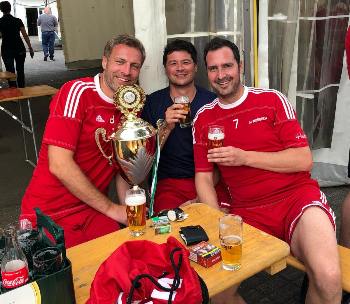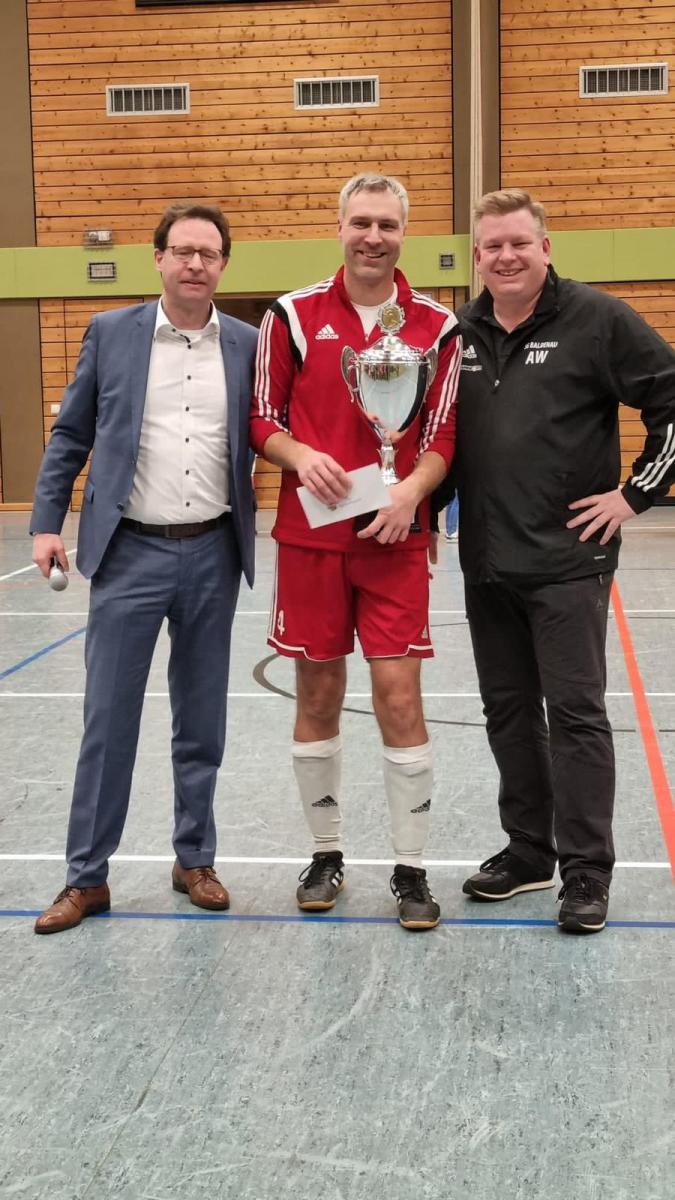 Schirmherr Andreas Hackethal, Spielführer Manuel Kirst und Achim Welgen bei der Pokalübergabe