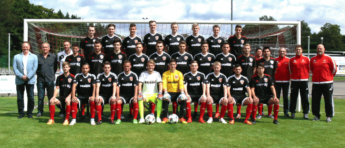 Mitte v.l.: 1. Vorsitzender Georg Schuh, 2. Vorsitzender Patrick Jung, 2. Vorsitzender Manuel Kirst, Tobias Kimmling, Kevin Schömer, Nils Greweling, Jonas Mart, Lars Stüber, Niko Schmitt, Dennis Schröder, Marius Botiseriu, Viktor Groß, Sportlicher Leiter Jörg Wahlen, Stefan Schweigerer, Torwartrainer Thomas Gutweiler, Co-Trainer Kai Hammes, Cheftrainer Thorsten Haubst